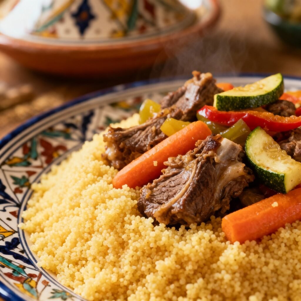 Couscous is a traditional Moroccan dish of steamed semolina topped with savory vegetables and tender meat