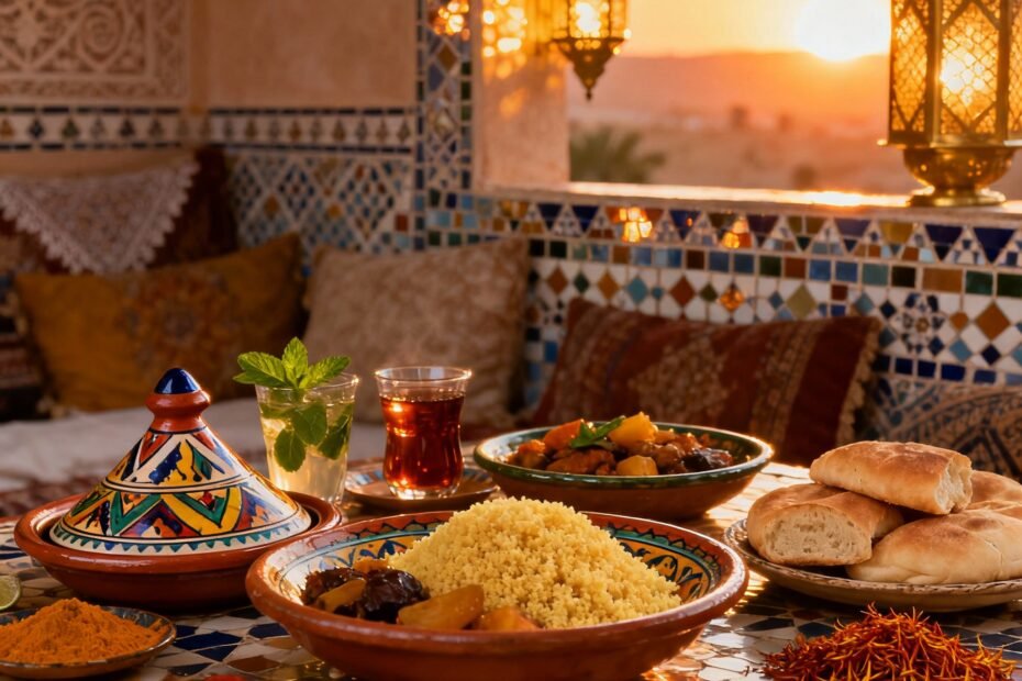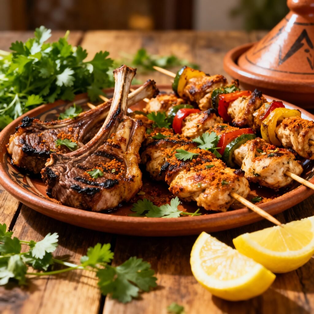 Grilled and roasted Moroccan dishes offer smoky, spiced flavors with tender meats and vibrant herbs.