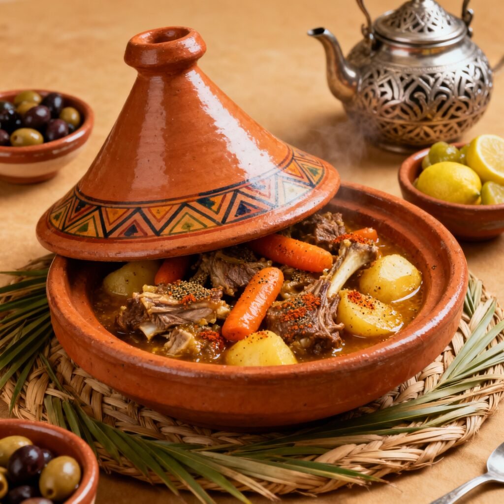 Tagine is a slow-cooked Moroccan stew bursting with rich spices and tender meat, served in a traditional clay pot